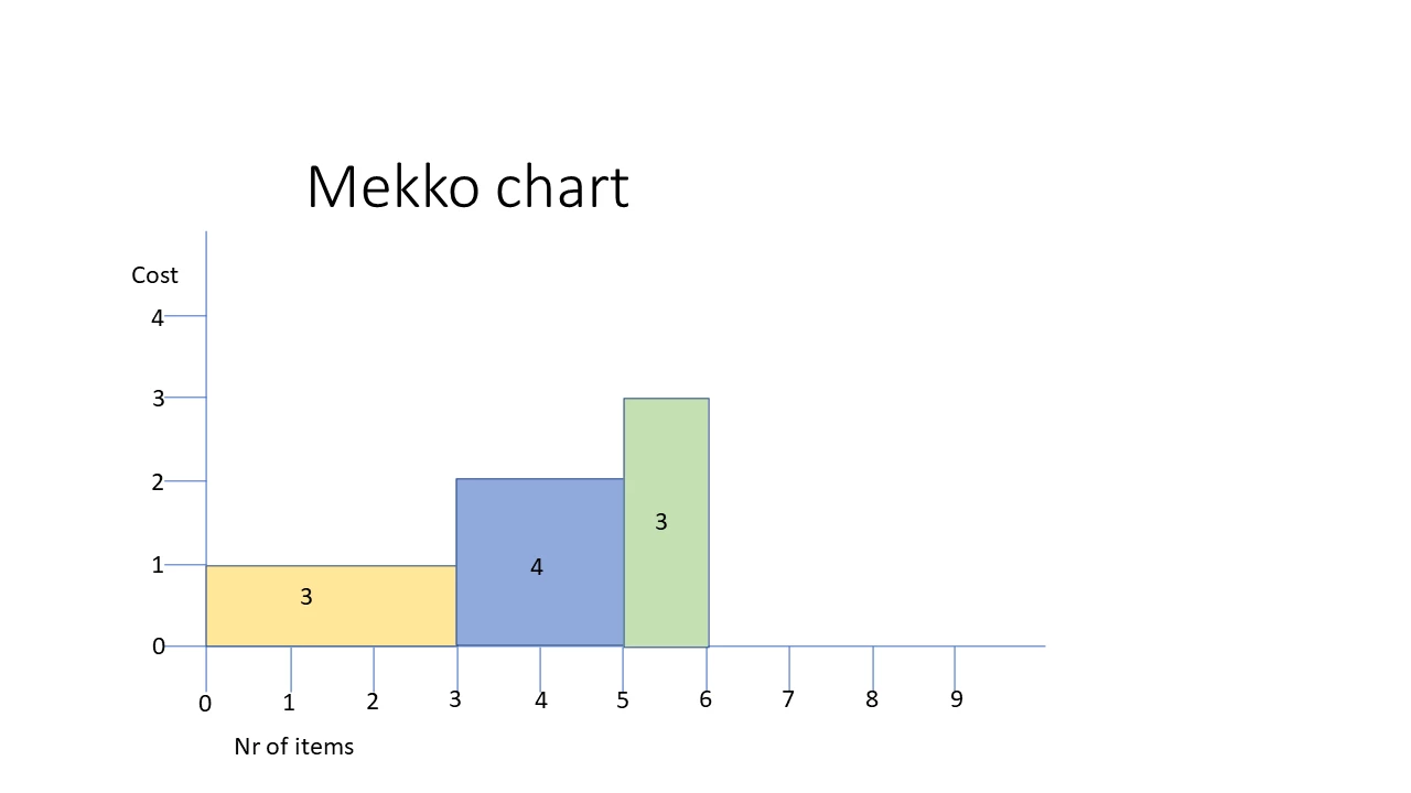 A Mekko Chart shows the relative importance of items by both height and width. See the following example: