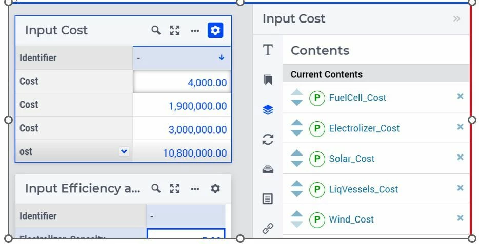 See Image 1) When creating the table “Input Cost” the identifier names on the first column are not the same as in the parameters. How can I adjust them? I also want to change to zero decimals but cannot find how to do so.